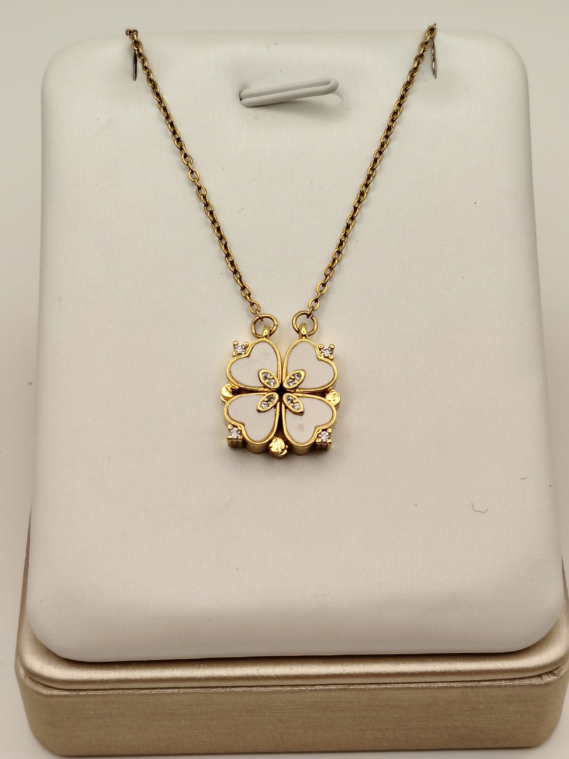 Laissez-vous séduire par ce collier trèfle transformable ! Conçu en acier inoxydable avec finition plaqué or et blanc, il cache un secret : dépliez-le pour révéler un deuxième pendentif élégant. Deux bijoux en un, c'est la magie de ce design astucieux et amusant. Parfait pour surprendre ou pour adapter votre look selon votre humeur, ce collier joue avec l'inattendu tout en conservant une allure sophistiquée. Un accessoire qui raconte une histoire à chaque port.